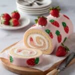 - Garnish and serve: Before serving, dust the cake roll with powdered sugar, decorate with sprinkles, and garnish with extra fresh strawberries. Slice into 8 portions and enjoy.