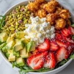 For a chic presentation, layer the salad ingredients in clear glass bowls or individual mason jars, showcasing the vibrant reds, greens, and creamy whites. Serving it family-style on a rustic wooden board with piles of caramelized almonds and pistachios for topping lets guests customize their own bowls. You can even stuff the salad inside hollowed-out strawberries or avocado halves for a fun appetizer twist.