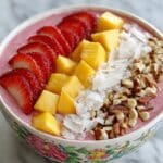 Sprinkle on granola for crunch, chia seeds for a nutritional boost, and fresh strawberry slices or other fruit for extra brightness and flavor. This final step turns your smoothie bowl into a feast for the eyes and palate.