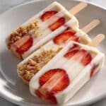 If you happen to have leftovers, keep them stored in the freezer inside the molds or wrap each pop tightly in plastic wrap to avoid freezer burn. Properly stored, they stay fresh and delicious for up to two weeks, so you can savor that blissful cheesecake and strawberry flavor any time.