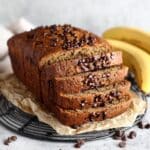 Slice the bread and toast it lightly to revive those chocolate chips’ melty goodness. You can also turn the slices into mini sandwiches with peanut butter or nutella for a fun twist. When bringing it to a gathering, arrange slices on a platter with a few whole bananas and small bowls of nuts and chocolate chips to invite guests to customize their own treats.