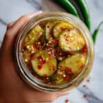 Definitely! The jalapeño provides extra spice, but it’s completely optional. You can omit it for a milder sweet heat pickle that still has plenty of flavor from the red pepper flakes and mustard seeds.