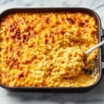 Bake your Thanksgiving Mac and Cheese Recipe in the preheated oven for 25 to 30 minutes until it’s bubbly and the topping is golden brown. Let it rest for about 5 minutes before serving, which allows the sauce to set slightly and makes it easier to scoop.