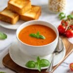 A comforting and creamy Tomato Basil Soup made with crushed and diced tomatoes, infused with fresh basil, garlic, and onion, then blended to a smooth texture and enriched with heavy cream. Served with crispy grilled cheese croutons made from buttery sourdough or white bread sandwiching melted cheddar or American cheese, perfect for a cozy lunch or dinner.