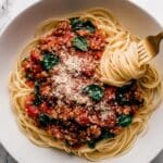 Dish out the pasta and sauce into bowls or plates. Sprinkle shredded Parmesan cheese generously on top and scatter fresh basil ribbons for an herbaceous, bright punch. Now you’re ready to dive into the magic that is Turkey Bolognese with Spaghetti and Fresh Basil Recipe.