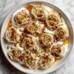 Turkish Dumplings with Garlicky Yogurt and Spiced Oil are delicate, handmade dumplings filled with seasoned ground lamb or beef, boiled to perfection, and served with a creamy garlic-infused yogurt sauce drizzled with a fragrant, spiced butter or olive oil. This traditional dish combines tender dough, savory meat, and vibrant spices for a comforting and flavorful meal perfect for sharing.