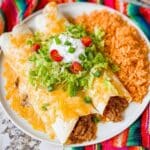 Place the rolled tortillas seam side down in a 9×13-inch baking dish. Once all are snugly in place, pour the remaining meat and sauce mixture evenly over the top, letting it cascade around every rolled tortilla. Cover the dish with foil and slide it into your preheated 350ºF oven. Bake for 20 minutes to meld the flavors and heat through.